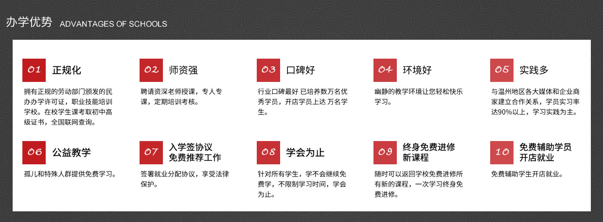 我校以培養實用型專業人才為目標,理論學習、操作訓練與專業實踐三位一體,實行一對一的教學模式,常年招生,男女不限。畢業后推薦工作、 主要是以理論為輔實操為主的教學模式授課。老師手把手教、一對一輔導,為學員量身定做課程,保證學會為止、 中途不收取任何費用,(無任何隱形消費)進修新的課程。、簽約教學、幫助學員開店就業,免費試學(讓您全方位的體驗我們的專業、讓你不花一分冤枉錢。)